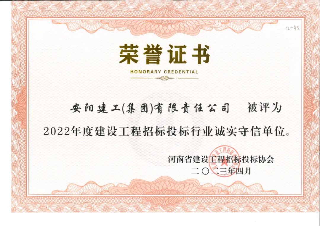 集團(tuán)公司榮獲2022年度河南省建設(shè)工程招標(biāo)投標(biāo)誠(chéng)實(shí)守信單位