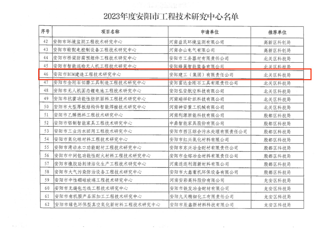 2023年9月,安陽市科技局發(fā)布了《關(guān)于認(rèn)定2023年度安陽市工程技術(shù)研究中心和重點(diǎn)實(shí)驗(yàn)室的通知 》(安科〔2023〕84號),我公司申請組建的“安陽市BIM建造工程技術(shù)研究中心”經(jīng)過積極申報(bào),主管部門層層審核,被成功認(rèn)定為“安陽市工程技術(shù)研究中心”,這是對我公司具備行業(yè)領(lǐng)先的研究開發(fā)與創(chuàng)新能力的認(rèn)可。