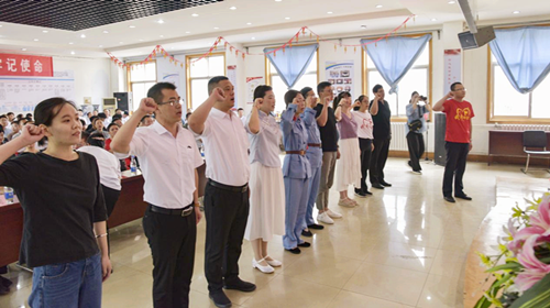 左驍強(qiáng)等11名新黨員在機(jī)關(guān)支部副書記黨飛同志的帶領(lǐng)下面向黨旗進(jìn)行入黨宣誓。