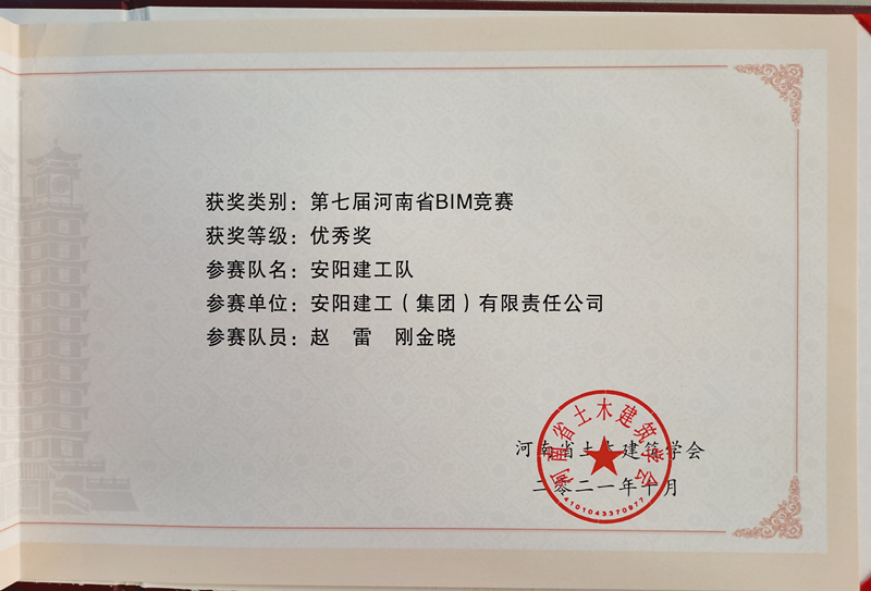 2021年9月24日-9月28日,我公司BIM中心趙雷主任及剛金曉代表集團公司參加河南省土木建筑學(xué)會舉辦的第七屆河南省建筑模型大賽,來自省內(nèi)多所高校、設(shè)計企業(yè)、施工企業(yè)及聯(lián)合體80多個團隊參賽,覆蓋面廣,業(yè)界關(guān)注度高。公司BIM代表隊最終榮獲優(yōu)秀獎。