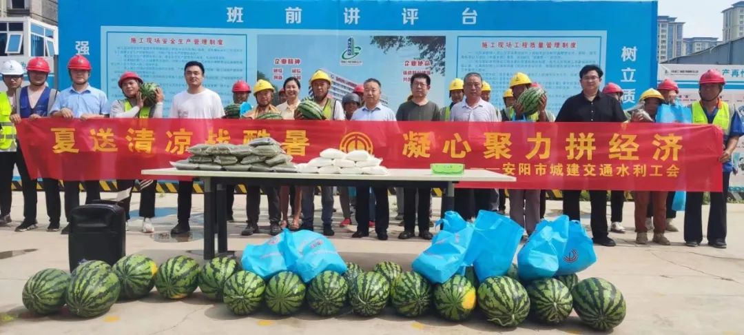 夏日的高溫天氣考驗著堅守并奮戰(zhàn)在生產(chǎn)一線的干部職工的同時,也牽動著集團公司領(lǐng)導(dǎo)們的心,為切實做好防暑降溫工作,確保一線職工安全度夏,促進(jìn)集團公司安全生產(chǎn),由公司工會牽頭,組織公司安全部、工程部,滿載綠豆、白糖、西瓜,毛巾、水杯等慰問品深入到一線各項目部和戶外作業(yè)的分公司,開展致敬勞動者“防暑降溫送關(guān)愛 心系員工送清涼”慰問活動,一份清涼,一份關(guān)懷,一個西瓜, 一份暖心。