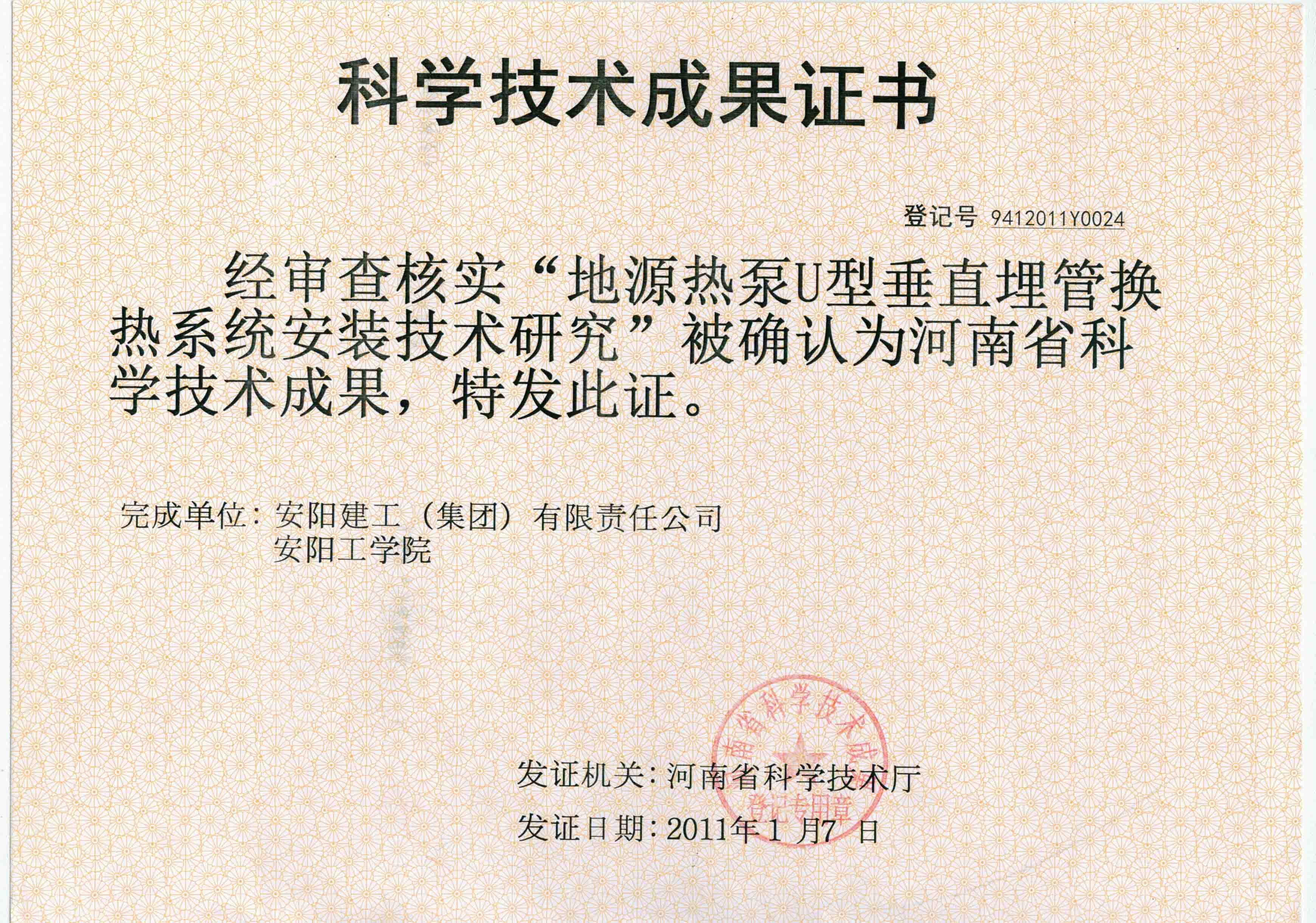 在集團(tuán)公司領(lǐng)導(dǎo)支持下,技術(shù)中心開拓科技項目的申報等渠道,現(xiàn)已涉足申報一項安陽市重大科技攻關(guān)項目。2010年12月《地源熱泵U型垂直埋管換熱系統(tǒng)安裝技術(shù)研究》順利通過了市科技局組織的專家鑒定,2011年1月經(jīng)河南省科學(xué)技術(shù)廳認(rèn)定為“河南省科學(xué)技術(shù)成果”。目前該成果課題正在申報安陽市科技進(jìn)步獎。
