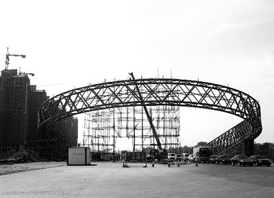 11日上午,記者根據(jù)高粲反映的情況,來到位于洛伊快速通道伊川界的伊川北大門施工現(xiàn)場看到,該大門外形是巨大的U形鋼架結(jié)構(gòu)拱門,外觀為紅色。整個拱門呈向北傾倒之勢,兩端用方形支柱撐起,拱門四周搭建的腳手架,顯示出該拱門仍在建設(shè)之中。