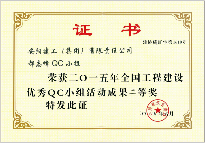 201562225日,中國(guó)建筑業(yè)協(xié)會(huì)工程建設(shè)質(zhì)量管理分會(huì)在云南昆明召開了“2015年全國(guó)工程建設(shè)優(yōu)秀QC小組活動(dòng)成果交流會(huì)”,對(duì)2015年優(yōu)秀QC小組活動(dòng)成果進(jìn)行了交流、表彰。我公司郝志峰QC小組活動(dòng)成果參加此次交流會(huì),并榮獲“2014年全國(guó)工程建設(shè)優(yōu)秀QC小組活動(dòng)成果二等獎(jiǎng)”的榮譽(yù)稱號(hào)。