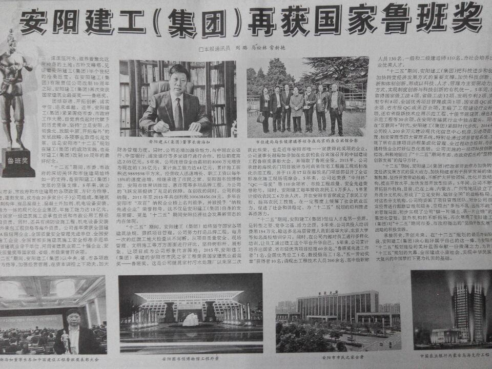 前不久,安陽(yáng)市政府、安陽(yáng)日?qǐng)?bào)聯(lián)合開(kāi)展了“十二五”宣傳活動(dòng),經(jīng)市住建局推薦,集團(tuán)辦公室馬松林、常新艷、劉璐寫(xiě)稿的《安陽(yáng)建工(集團(tuán))再獲國(guó)家魯班獎(jiǎng)》榮登2015年12月10日安陽(yáng)日?qǐng)?bào)第二版。