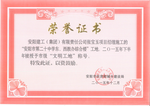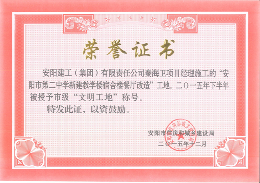 在2016年開(kāi)工的第一周,從安陽(yáng)市住房和城鄉(xiāng)建設(shè)局獲悉,我公司承建的“安陽(yáng)市第二十中學(xué)教辦樓”、“安陽(yáng)市第二中學(xué)新建教學(xué)樓宿舍樓餐廳改造”榮獲2015年度下半年市級(jí)安全文明標(biāo)準(zhǔn)化工地稱(chēng)號(hào)。此次評(píng)選,市住建局協(xié)同相關(guān)部門(mén)嚴(yán)格按照《河南省安全文明工地評(píng)審辦法》和《安陽(yáng)市安全文明工地評(píng)審辦法》,旨在鼓勵(lì)先進(jìn)、鞭策后進(jìn)、共同進(jìn)步,對(duì)各施工企業(yè)申報(bào)的安全文明工地進(jìn)行的一次檢查和評(píng)比。