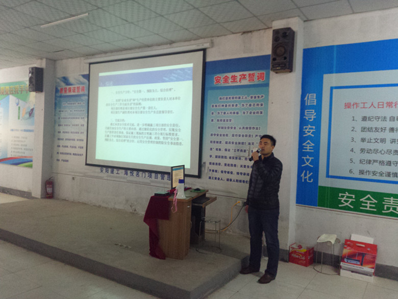 為了提高工人安全意識,排除工地安全隱患,杜絕安全事故發(fā)生,海悅名門項目部于2016年3月15日,利用午休時間,召開了本年度的三級安全教育培訓(xùn)大會,海悅名門項目所有人員和公司其他項目上的安全員一同參加,約計300余人。會上首先為大家放映了安全教育短片,然后分別請公司工程部馮亮部長、海悅名門項目經(jīng)理賈成偉、副經(jīng)理張磊、安全主管崔相平對本項目的一線員工進(jìn)行了一二三級安全教育培訓(xùn)。臺下工人聽的認(rèn)真,臺上領(lǐng)導(dǎo)講的生動,整場大會井然有序。