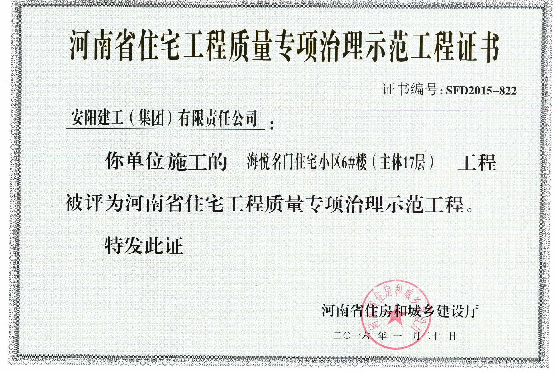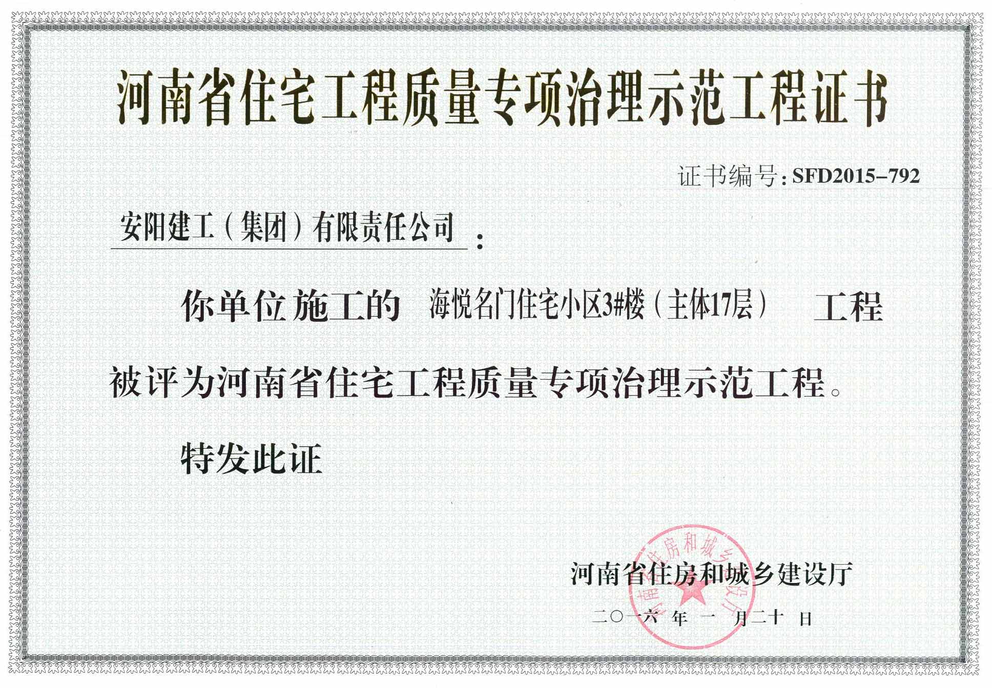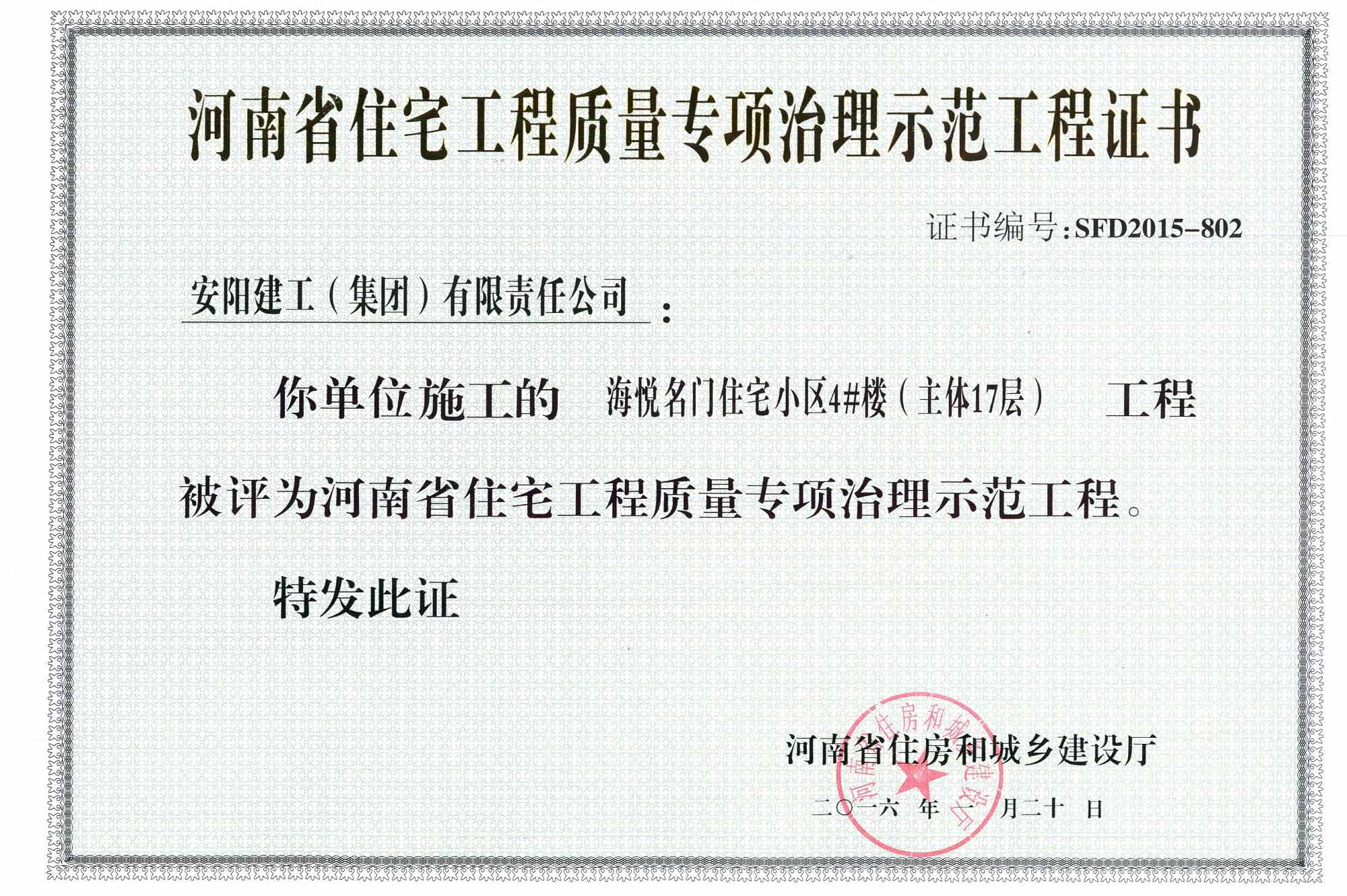 我公司施工的海悅名門住宅小區(qū)3#樓、4#樓、5#樓、6#樓工程榮獲“2015年度河南省住宅工程質(zhì)量專項治理示范工程”榮譽。這是我公司按照住房和城鄉(xiāng)建設(shè)部工程質(zhì)量兩年專項治理活動的工作部署以及《關(guān)于做好全省住宅工程質(zhì)量專項質(zhì)量示范工程評審工作的通知》要求,由安陽市住房和城鄉(xiāng)建設(shè)主管部門推薦申報,專家組現(xiàn)場復查,河南省住宅質(zhì)量示范工程評審委員會評審之后得到的評價。