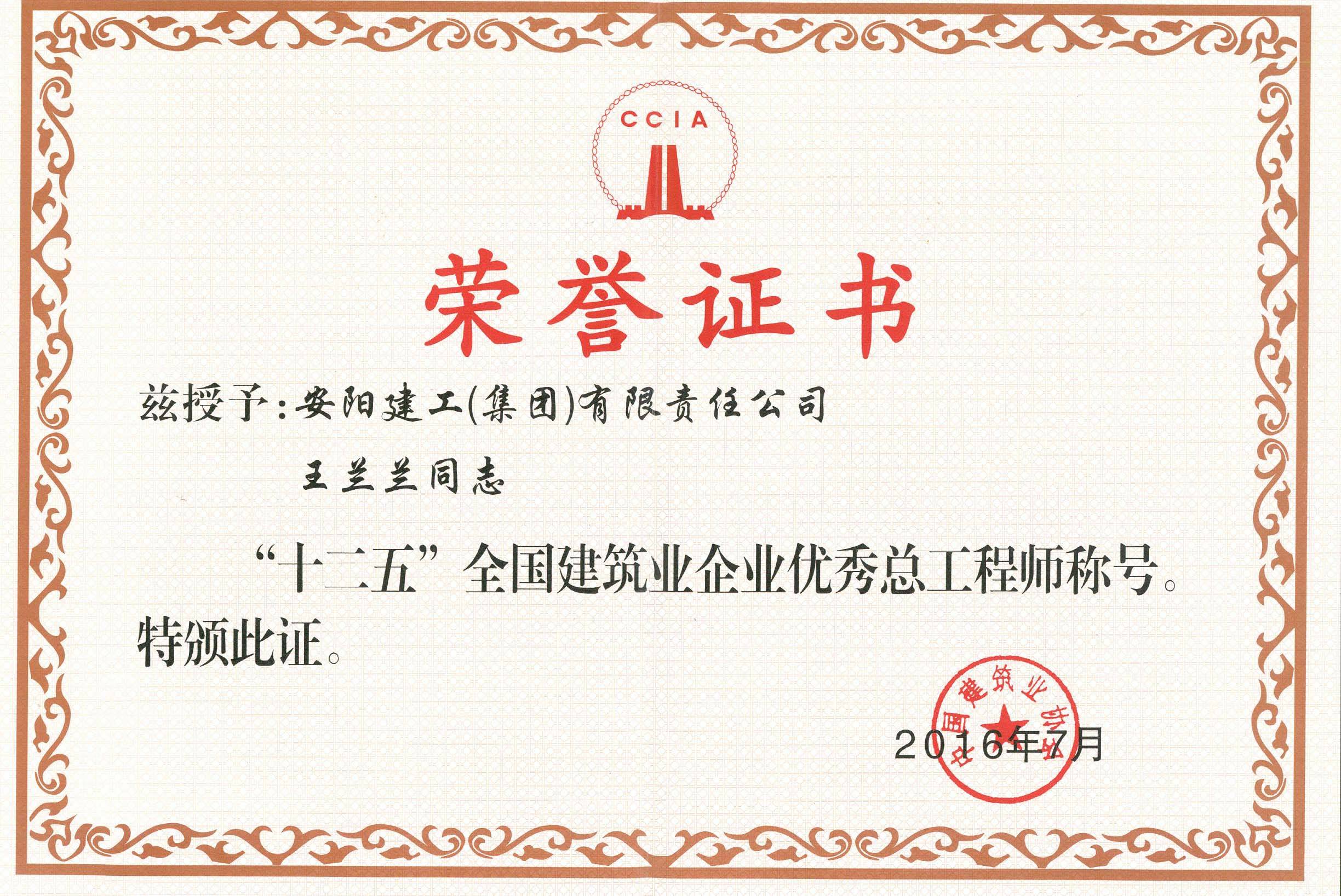 安陽(yáng)建工集團(tuán)總工程師王蘭蘭同志榮獲“十二五”全國(guó)建筑業(yè)企業(yè)優(yōu)秀總工程師
