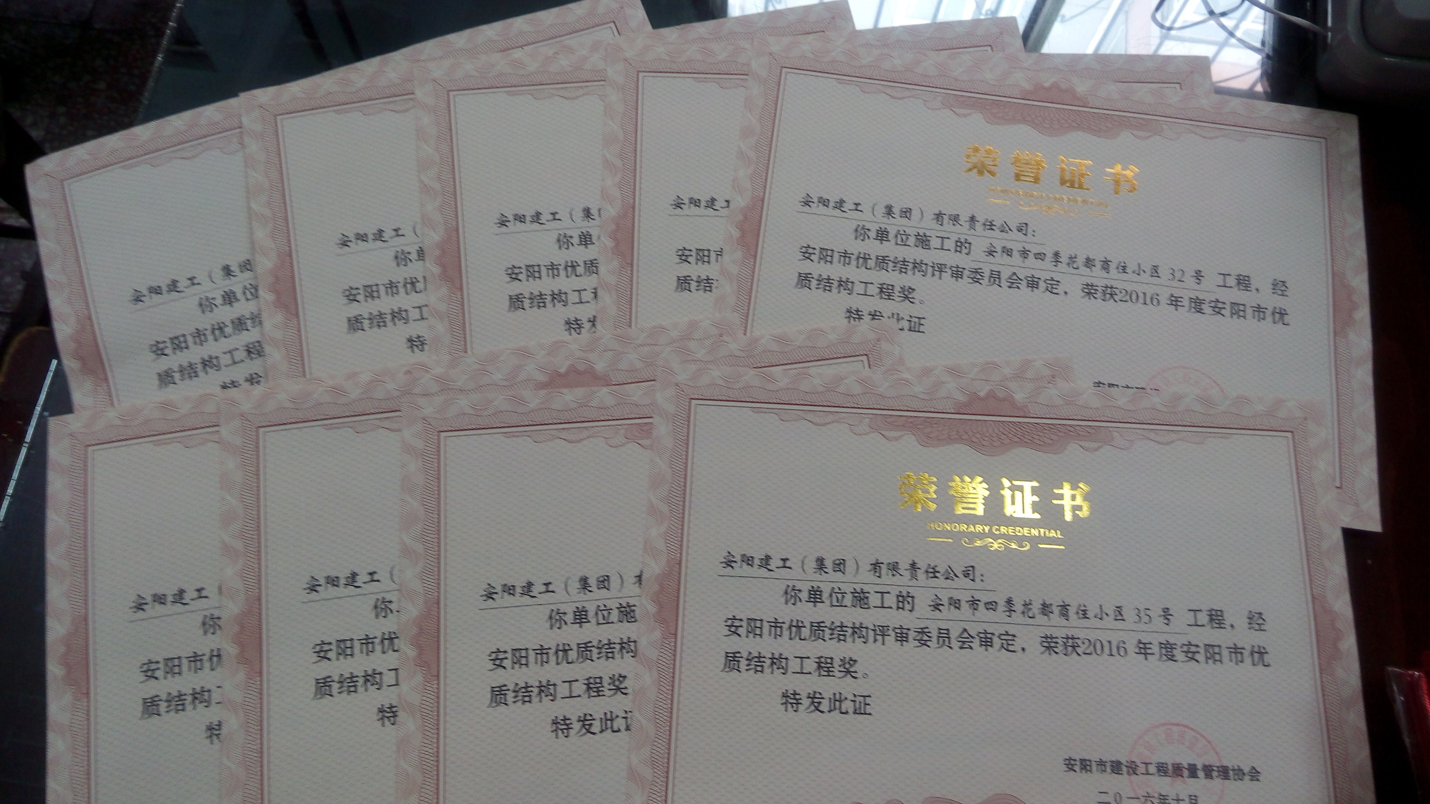 安陽(yáng)市四季花都商住小區(qū)31號(hào)工程;安陽(yáng)市四季花都商住小區(qū)32號(hào)工程;安陽(yáng)市四季花都商住小區(qū)33號(hào)工程;安陽(yáng)市四季花都商住小區(qū)34號(hào)工程;安陽(yáng)市四季花都商住小區(qū)35號(hào)工程;安陽(yáng)市四季花都商住小區(qū)36號(hào)工程;安陽(yáng)市四季花都商住小區(qū)37號(hào)工程;安陽(yáng)市飛翔學(xué)校建設(shè)(一期)項(xiàng)目工程;安陽(yáng)市第八水廠工程;安陽(yáng)市香山甲第2號(hào)樓;安陽(yáng)市香山甲第5號(hào)樓;安陽(yáng)市香山甲第6號(hào)樓;安陽(yáng)市香山甲第7號(hào)樓;安陽(yáng)市香山甲第8號(hào)樓等14項(xiàng)工程被評(píng)為2016年度安陽(yáng)市優(yōu)質(zhì)結(jié)構(gòu)工程獎(jiǎng)。