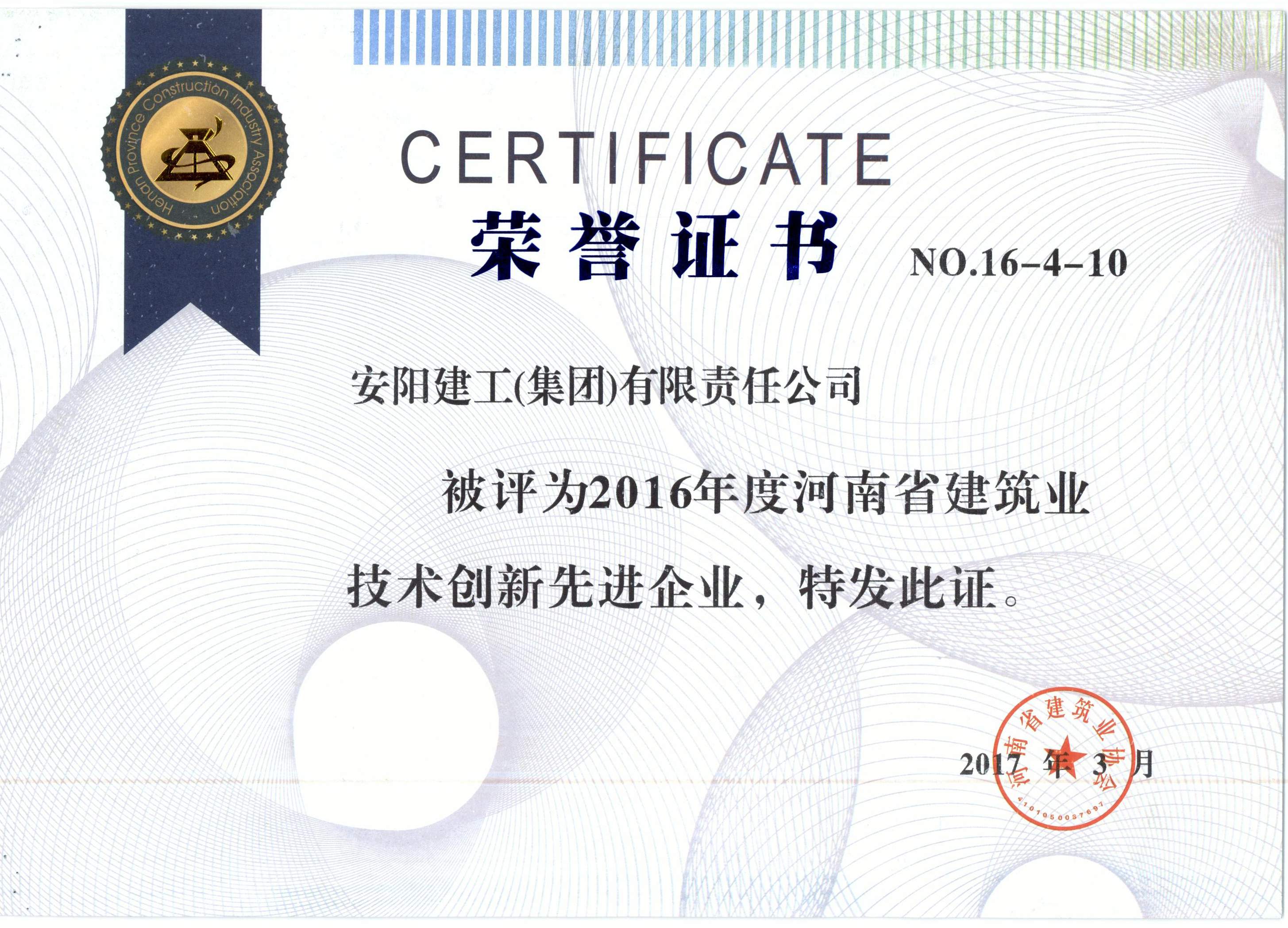 我公司被評為2016年河南省建筑業(yè)技術創(chuàng)新先進企業(yè)