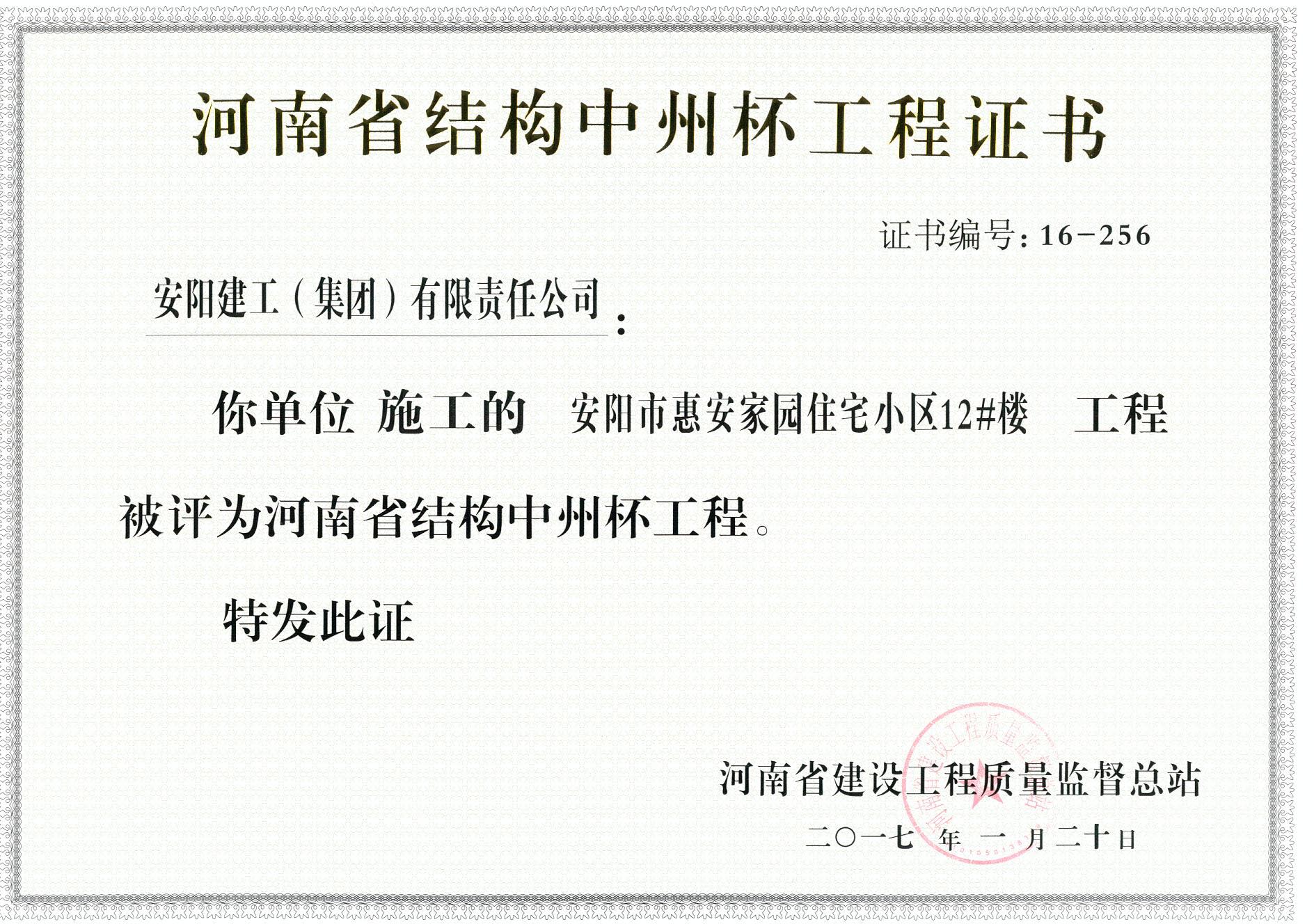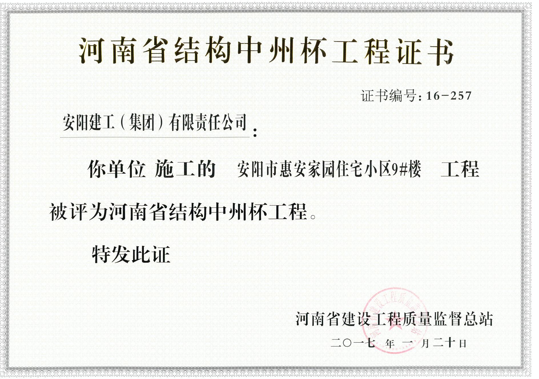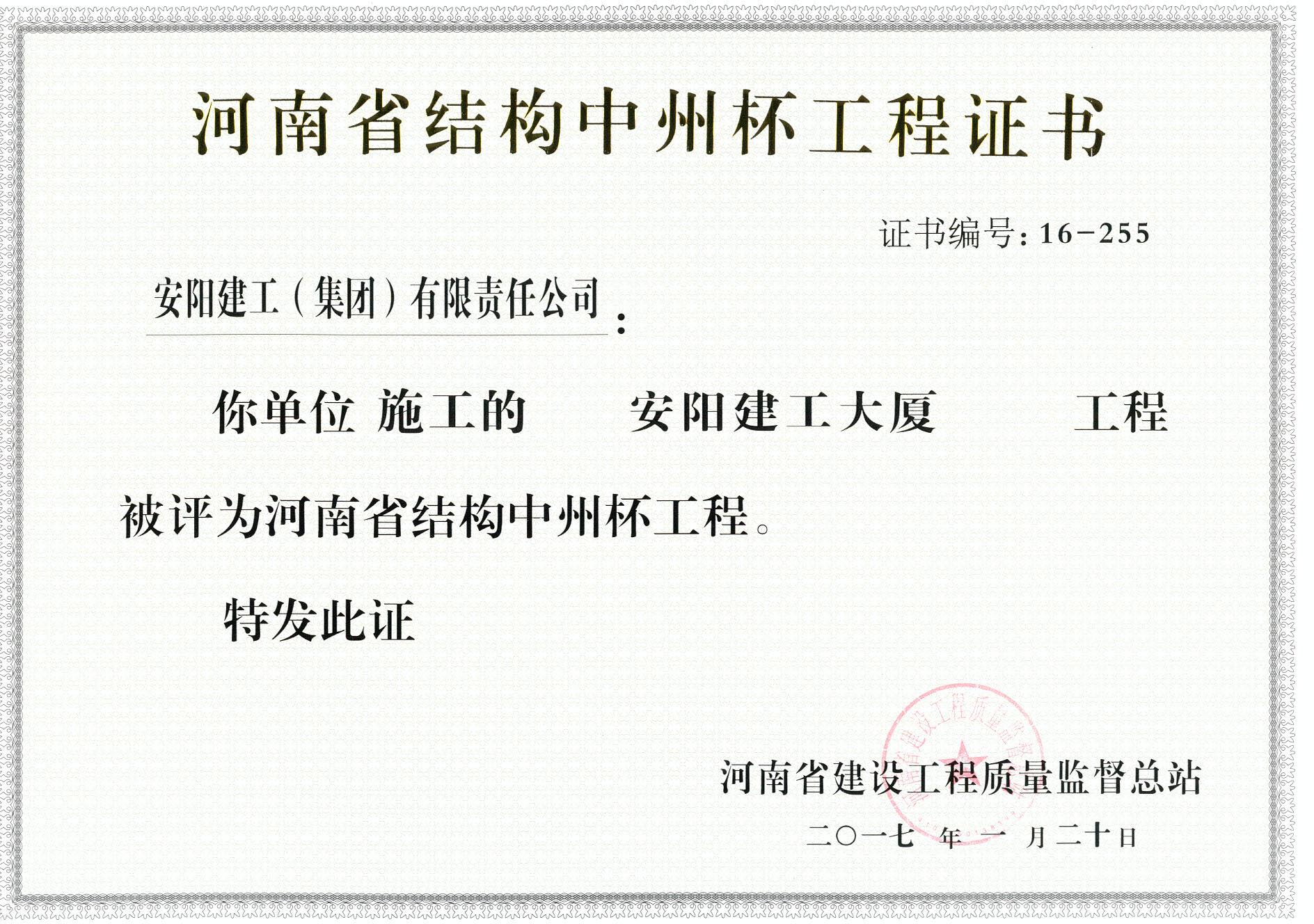 我公司八個(gè)項(xiàng)目榮獲河南省中州杯工程證書