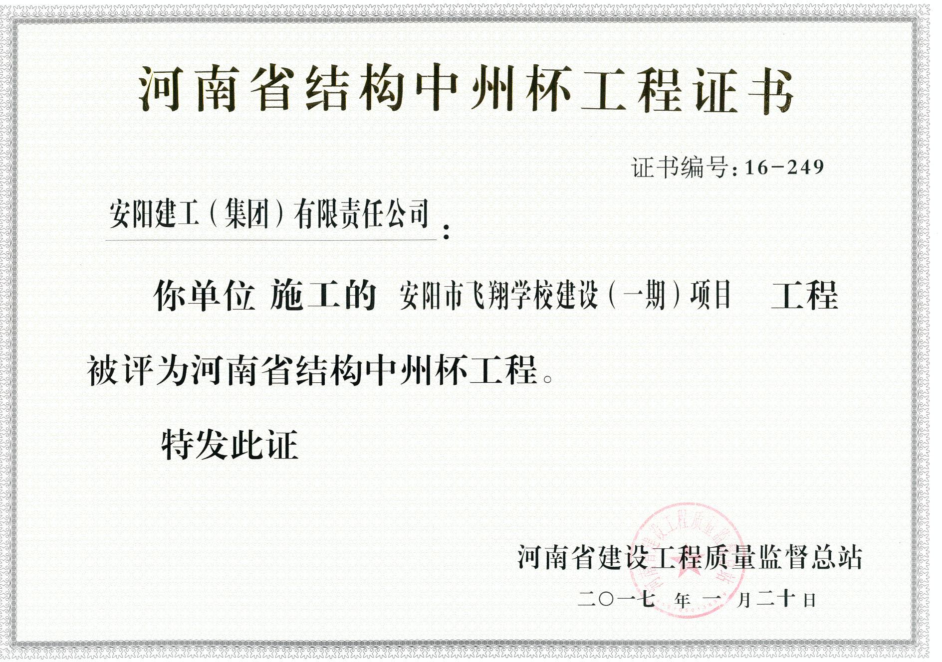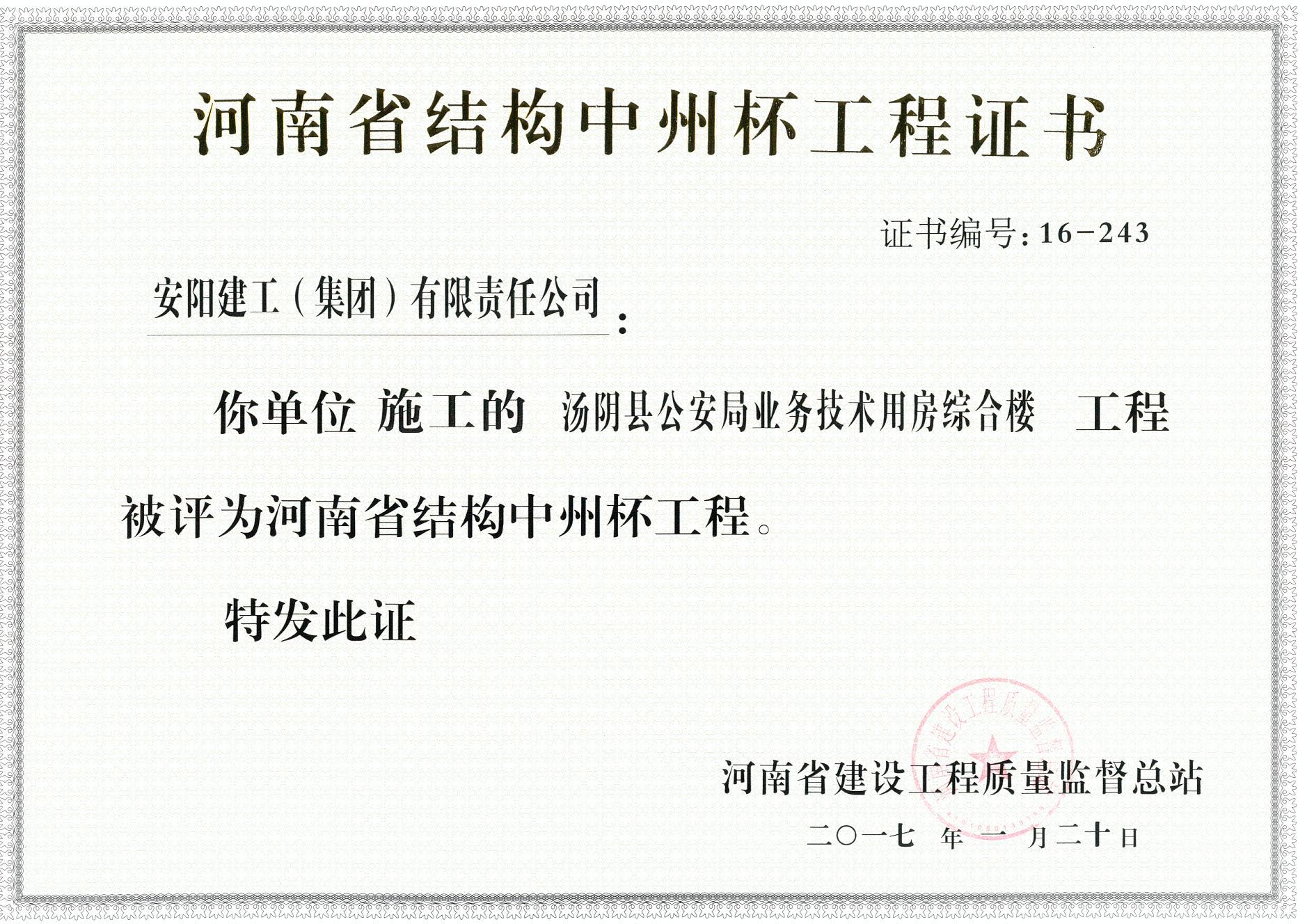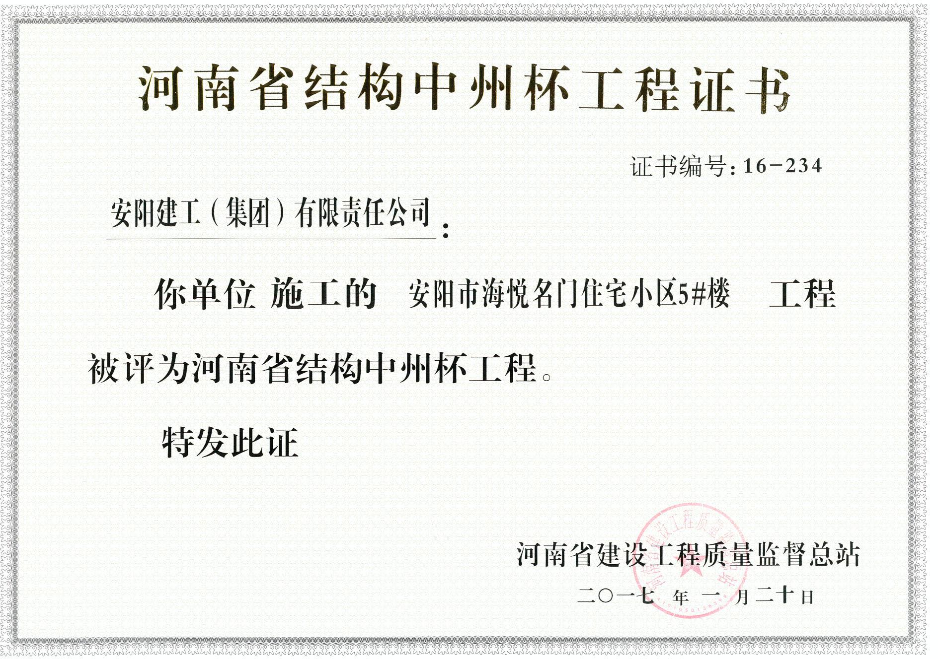 我公司八個(gè)項(xiàng)目榮獲河南省中州杯工程證書