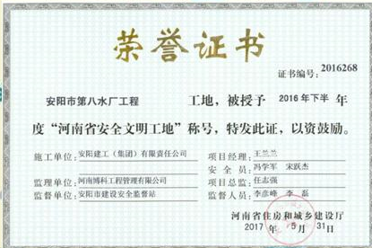 我公司第八水廠工程榮獲“河南省安全文明工地”稱號