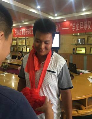 拜師儀式上,學生向自己的師傅鞠躬、敬茶,獻花,行拜師禮。指導老師代表原國瑞發(fā)言表態(tài),“一定恪盡職守,全力教導,起到帶頭示范作用”,學生代表在隨后的發(fā)言中表示,“一定虛心請教,把師傅作為學習的楷?!薄?/span>