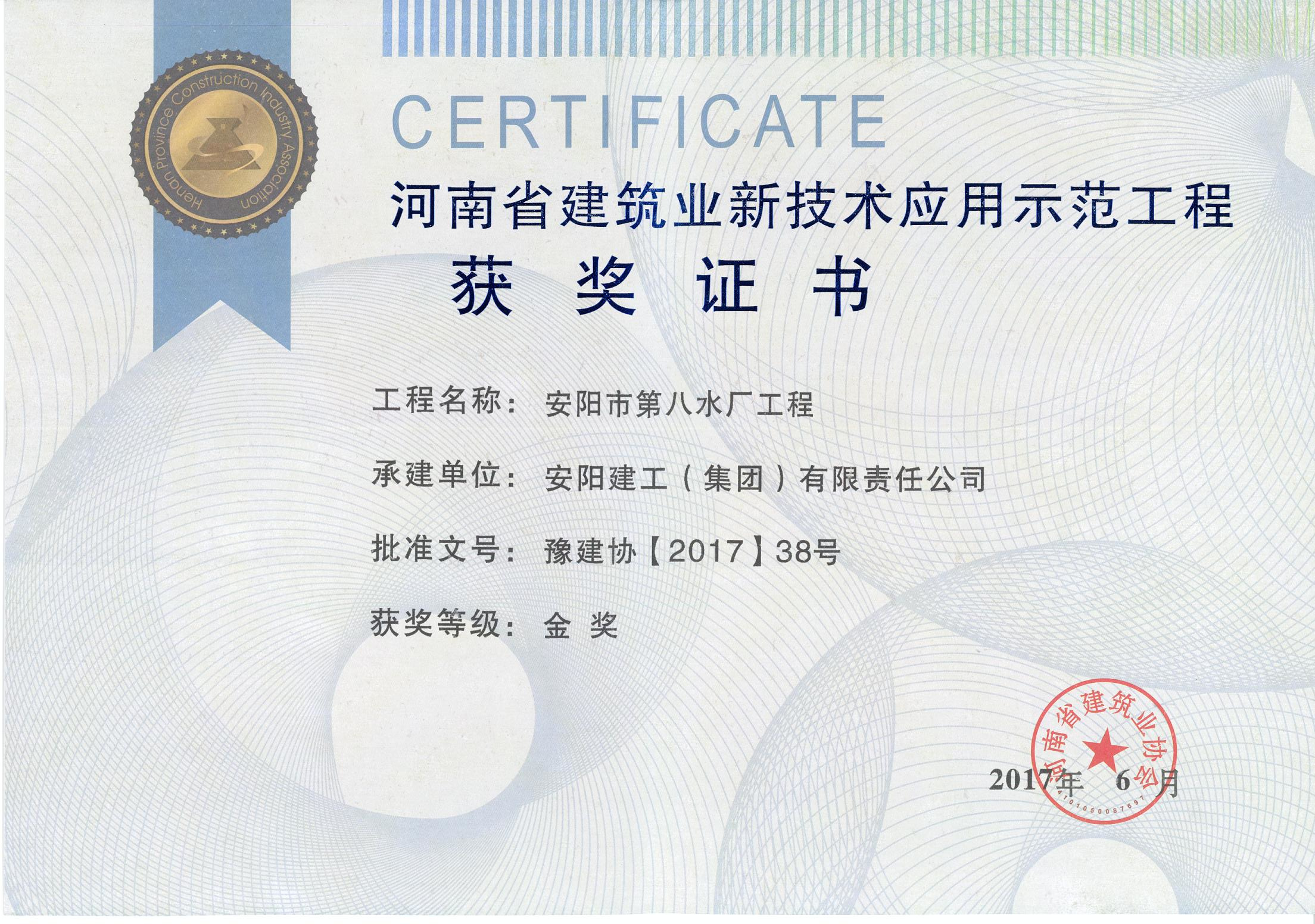 我公司安陽第八水廠項(xiàng)目榮獲17年省建筑業(yè)新技術(shù)應(yīng)用示范工程