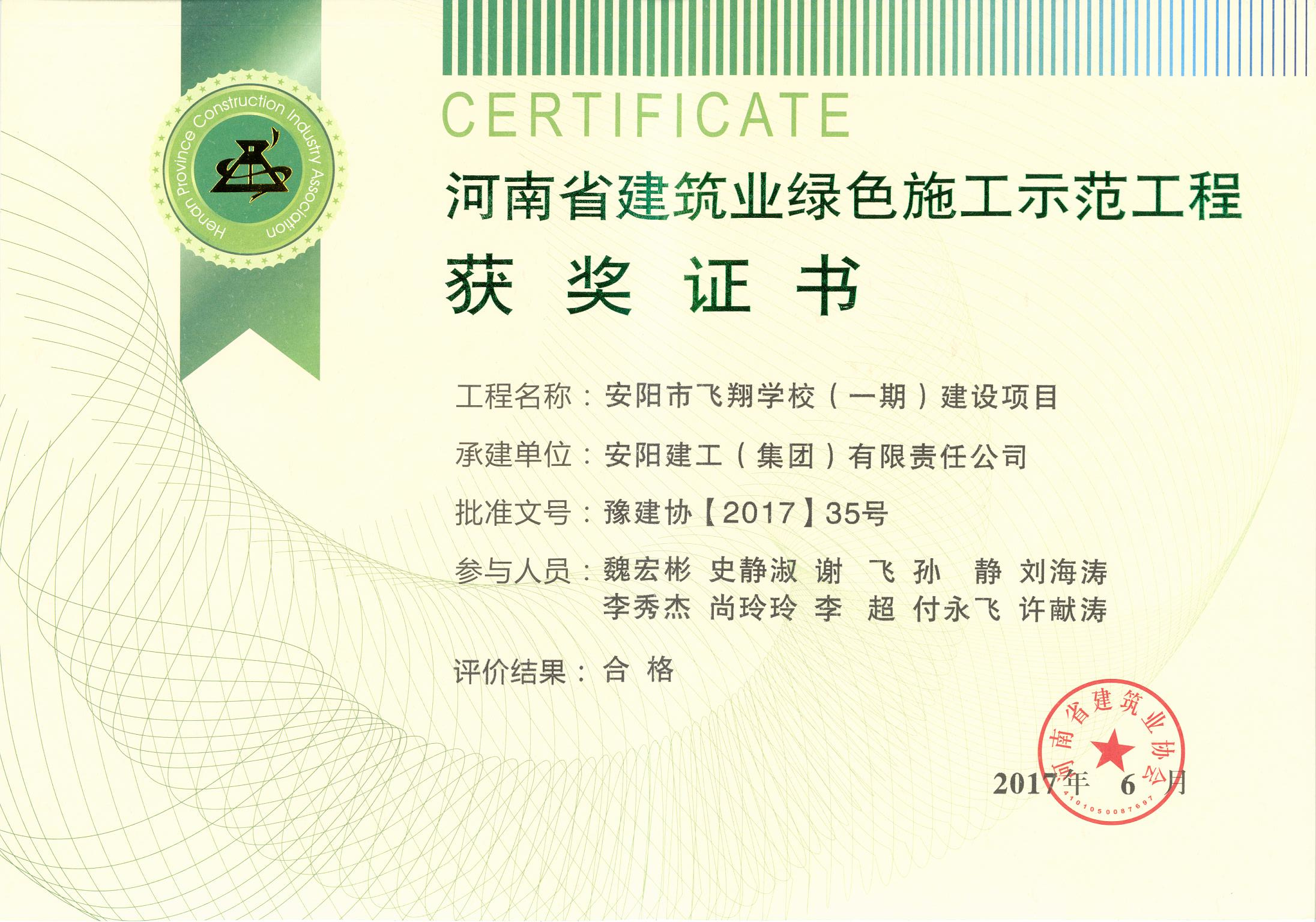我公司安陽市飛翔學(xué)校一期項(xiàng)目榮獲17年省建筑業(yè)綠色施工示范工程