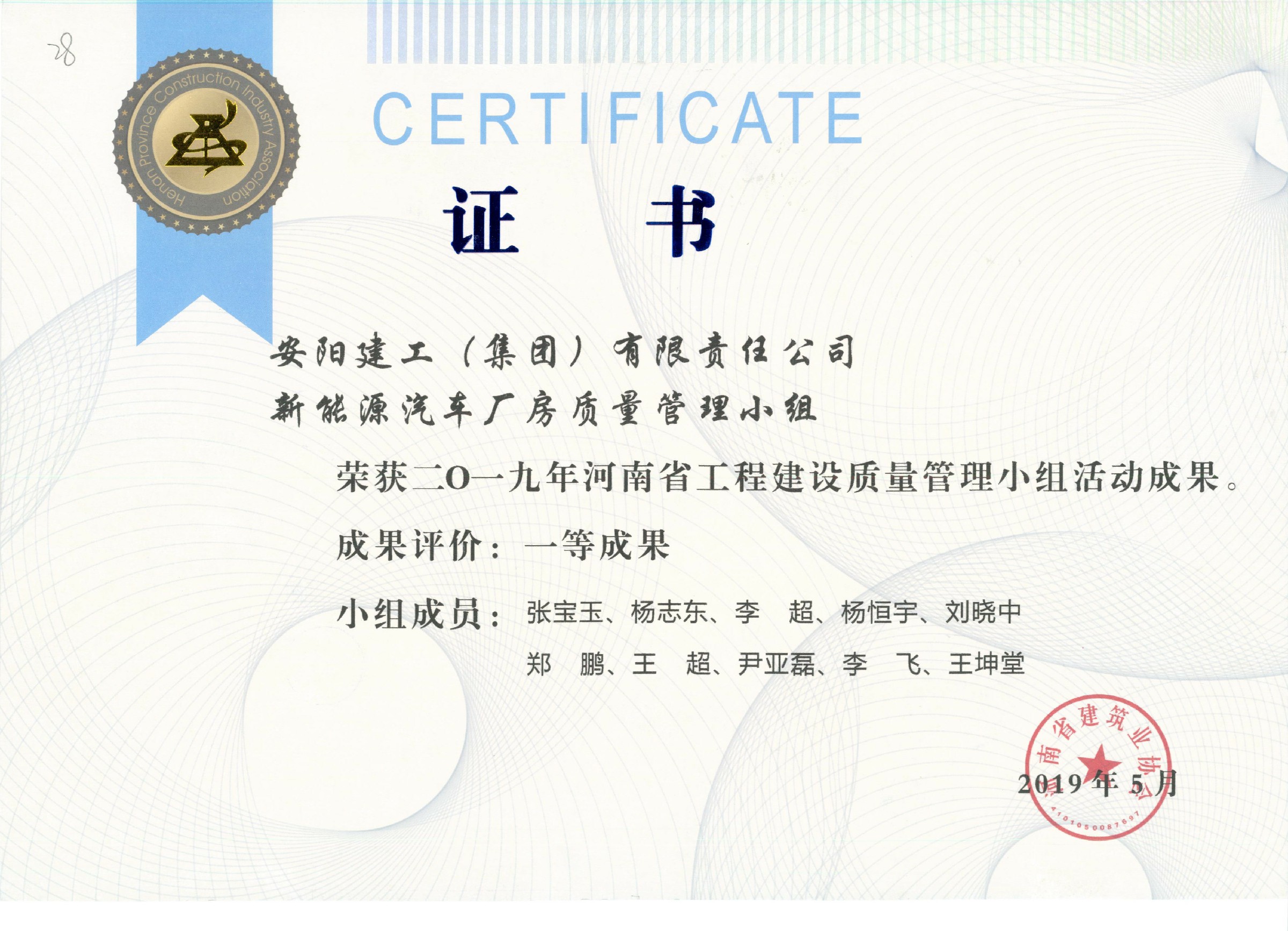 我公司新能源汽車(chē)廠房QC小組榮獲2019年河南省工程建設(shè)QC小組活動(dòng)成果一等獎(jiǎng)