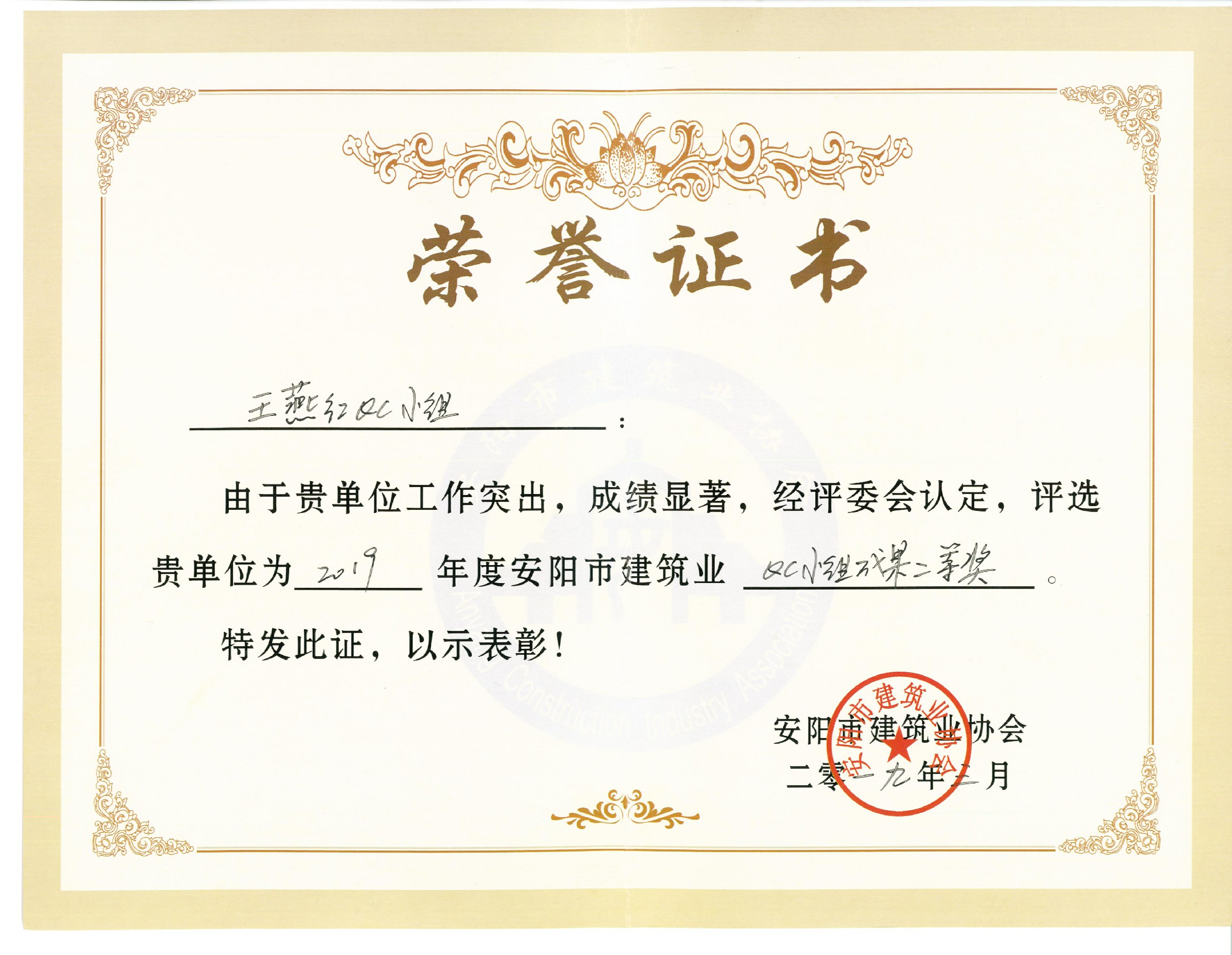 我公司王燕紅QC小組榮獲2019年安陽市建筑業(yè)QC小組成果二等獎(jiǎng)