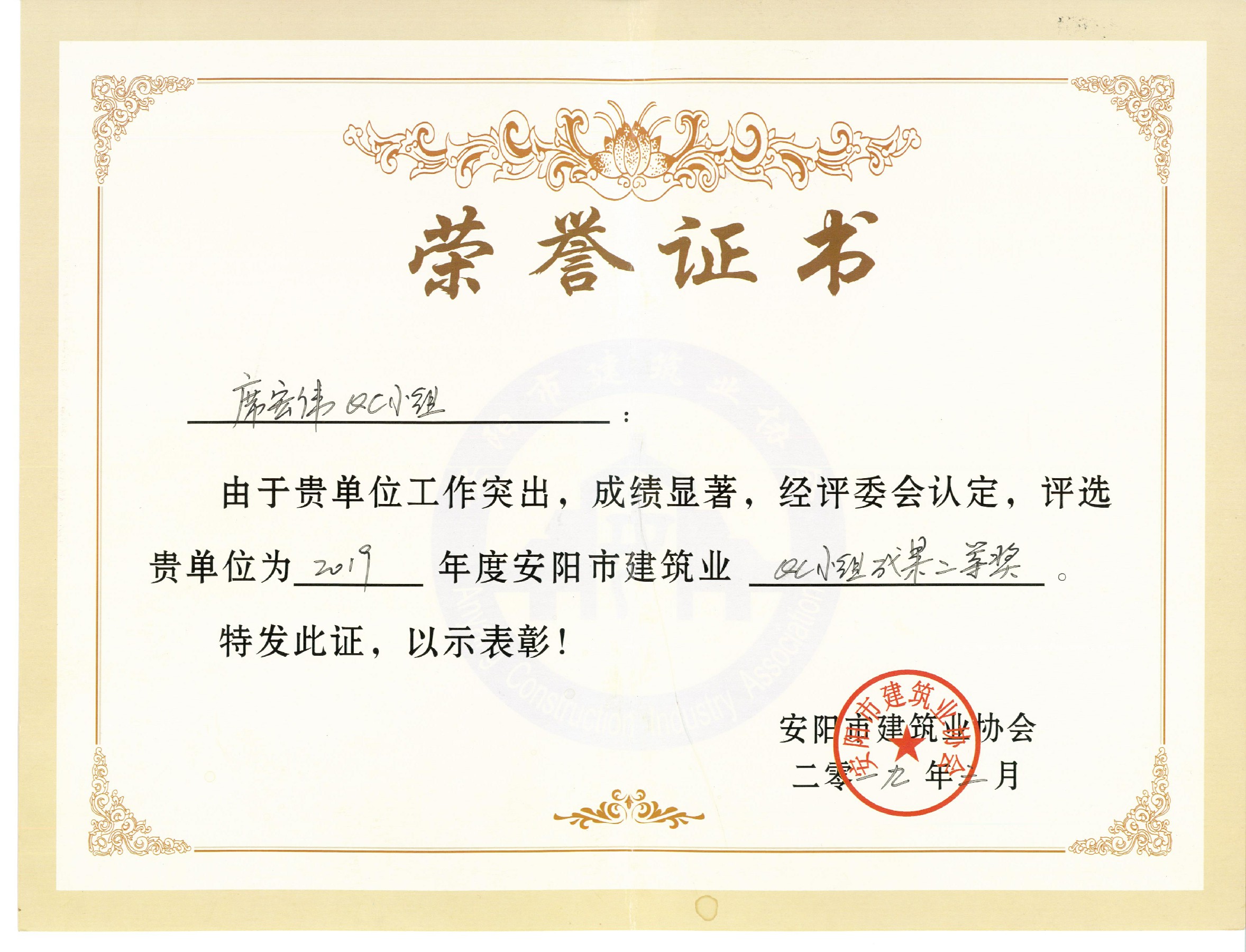 我公司席宏偉QC小組榮獲2019年安陽市建筑業(yè)QC小組成果二等獎