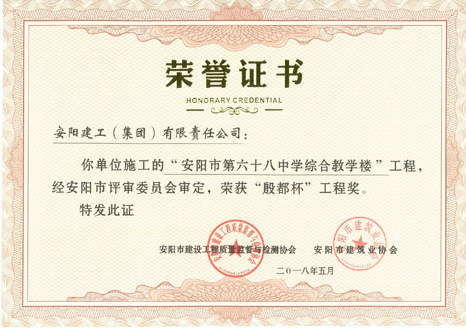我公司承建的安陽市六十八中綜合教學樓項目榮獲2018年度安陽市殷都杯工程獎