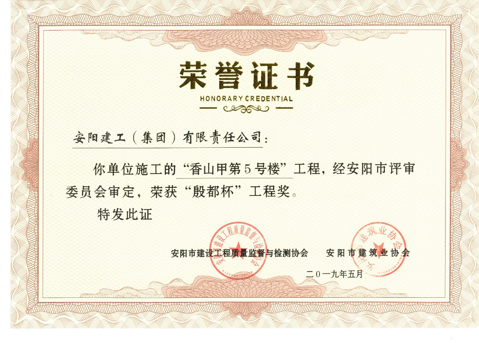 我公司承建的安陽市香山甲第5#6#樓項目榮獲2019年度安陽市殷都杯工程獎