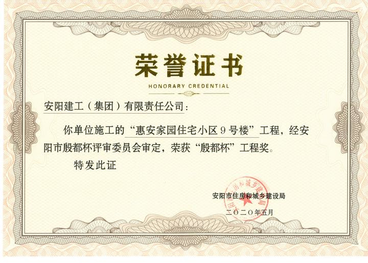我公司承建的安陽市惠安家園9#12#樓項目榮獲2020年度安陽市殷都杯工程獎