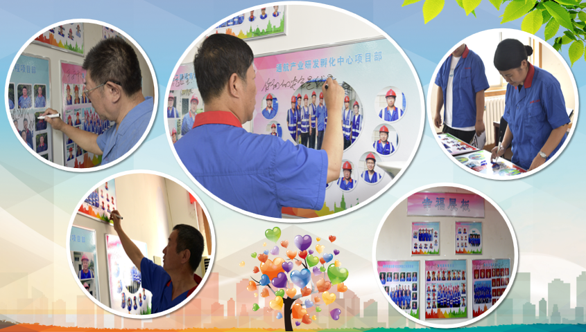 今年會場兩邊的幸福展板是一道靚麗的風景線,展板上展示的是各項目部大家庭的照片,照片上一張張可愛的笑臉,讓人看了如沐春風,傳遞著建工人積極進取的精神面貌,每位領(lǐng)導都在照片上簽上了安全祝福語。