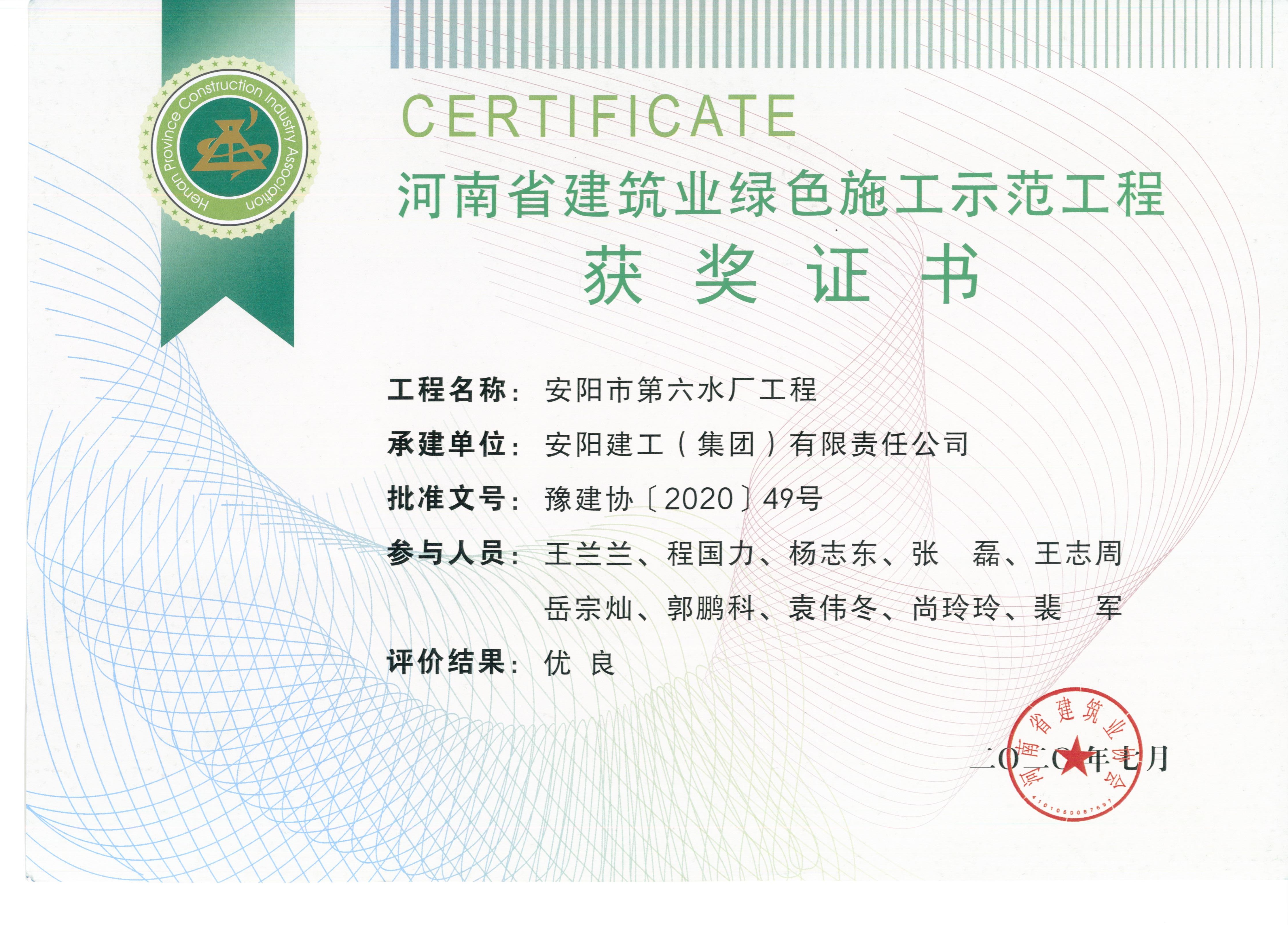 我公司安陽(yáng)市第六水廠工程項(xiàng)目榮獲2020年河南省建筑業(yè)綠色施工示范工程