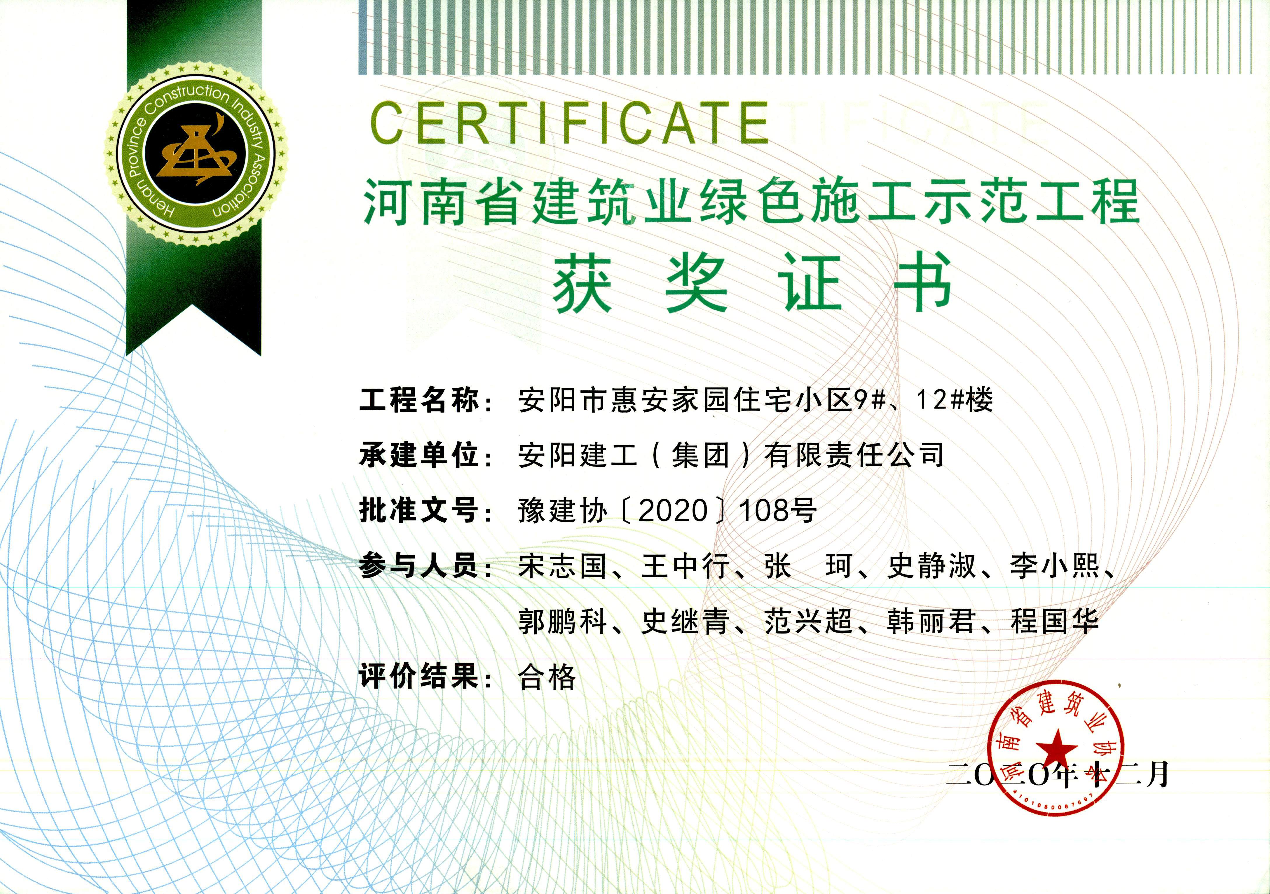 我公司安陽市惠安家園住宅小區(qū)9#、12#樓榮獲河南省建筑業(yè)綠色施工示范工程