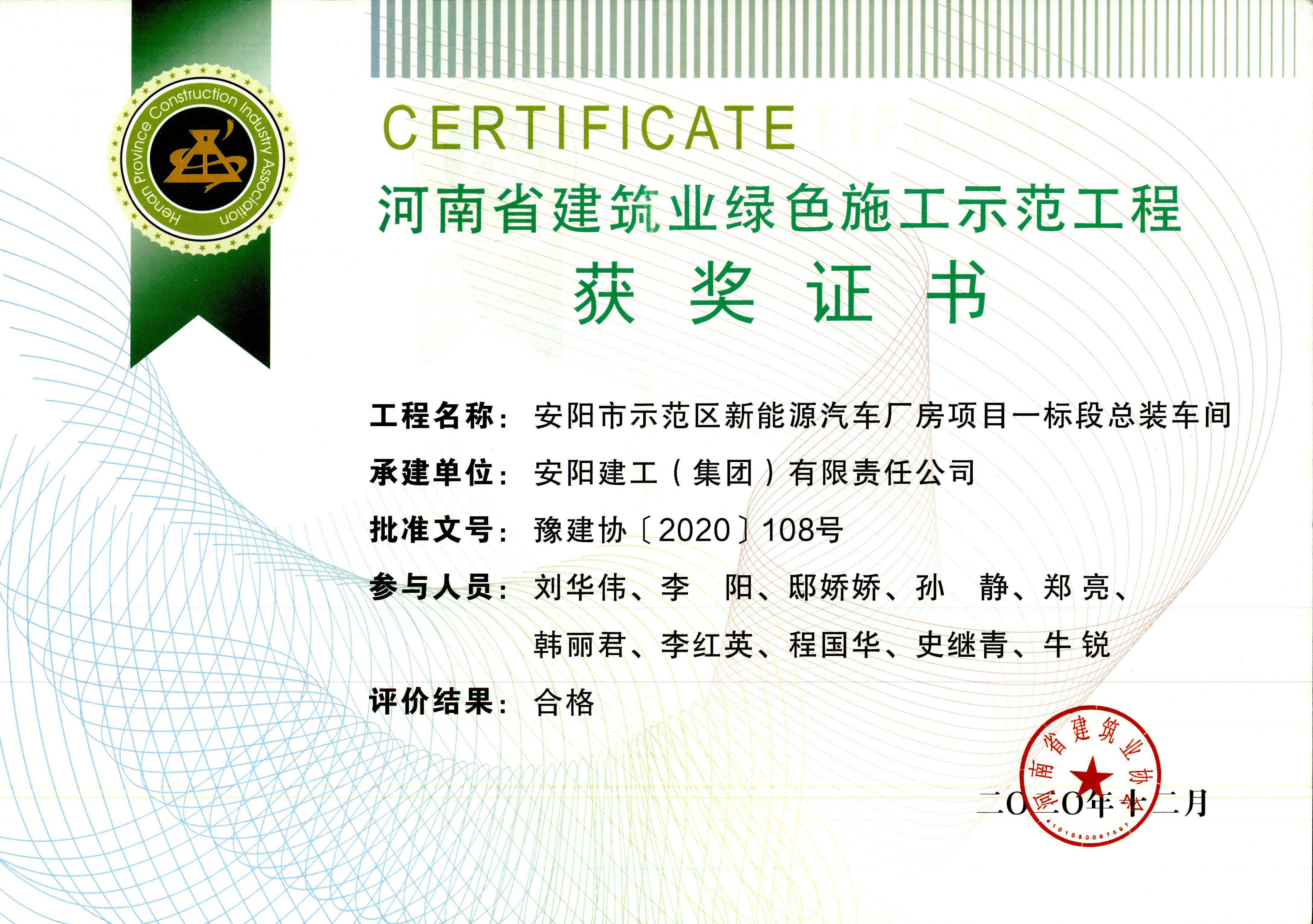 我公司安陽市示范區(qū)新能源汽車廠房項目一標(biāo)段總裝車間榮獲河南省建筑業(yè)綠色施工示范工程