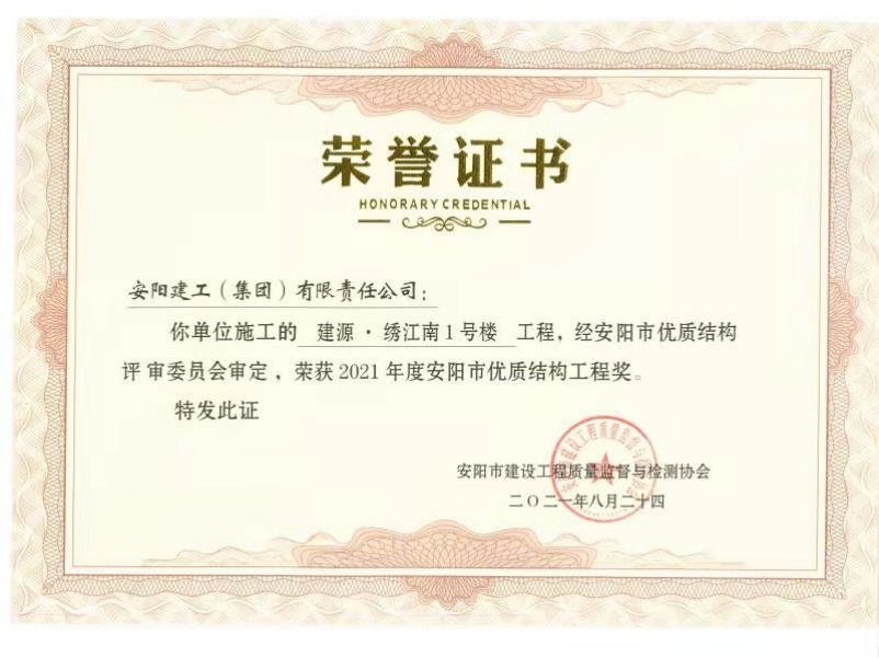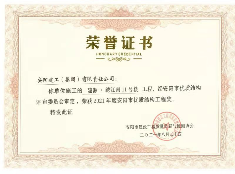 金秋九月,桂花飄香,建源繡江南項(xiàng)目經(jīng)過(guò)一年半的緊張施工,已進(jìn)入裝飾裝修階段。經(jīng)過(guò)參建方的共同努力,在20219月3日,建源·繡江南1#、6#、11#樓榮獲安陽(yáng)市優(yōu)質(zhì)結(jié)構(gòu)獎(jiǎng)。