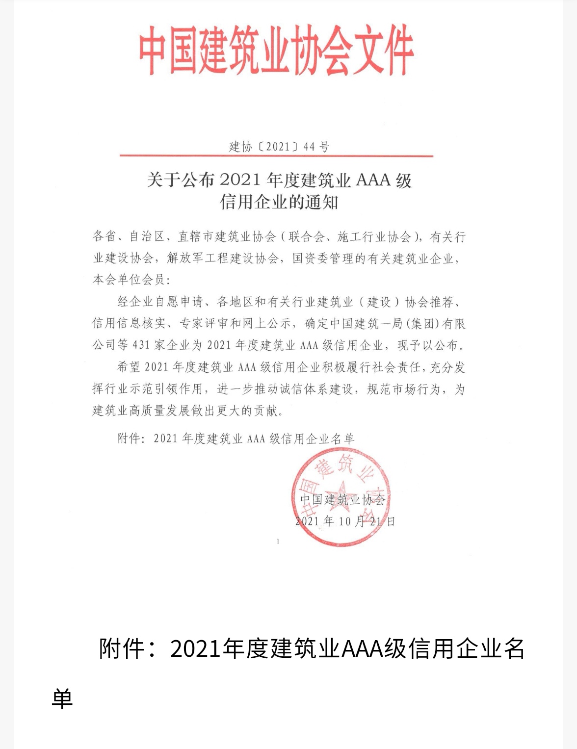 喜報(bào)!集團(tuán)公司連續(xù)獲評(píng)“2021年度建筑業(yè)AAA級(jí)信用企業(yè)”