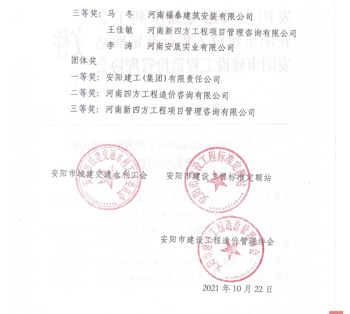 喜訊!安陽建工集團(tuán)在“安陽市第四屆工程造價(jià)技能大賽”中 榮獲團(tuán)體一等獎(jiǎng)、包攬土建個(gè)人獎(jiǎng)一、二名
