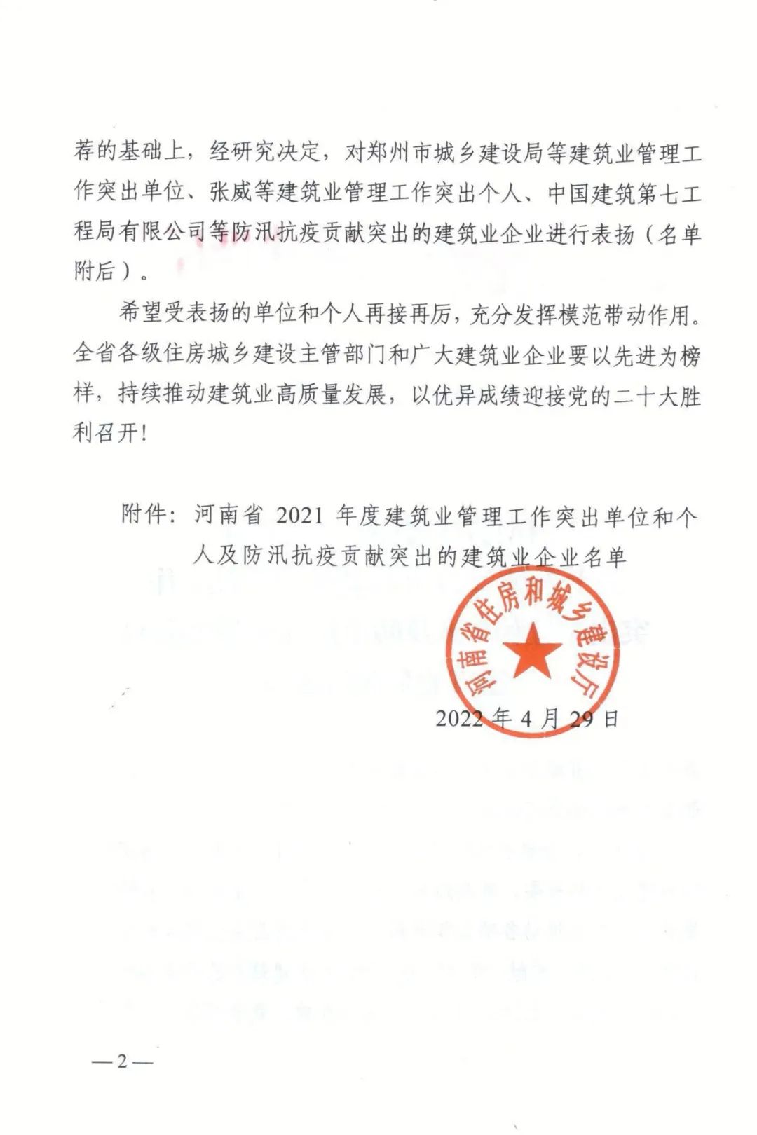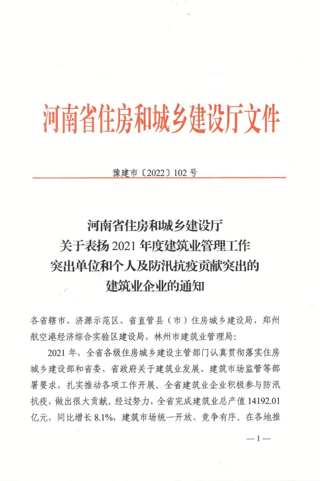 近日,河南省住房和城鄉(xiāng)建設(shè)廳印發(fā)《關(guān)于表?yè)P(yáng)2021年度建筑業(yè)管理工作突出單位和個(gè)人及防汛抗疫貢獻(xiàn)突出的建筑業(yè)企業(yè)的通知》(豫建市〔2022〕102號(hào))對(duì)河南省20家防汛抗疫貢獻(xiàn)突出的建筑業(yè)企業(yè)進(jìn)行表?yè)P(yáng)。