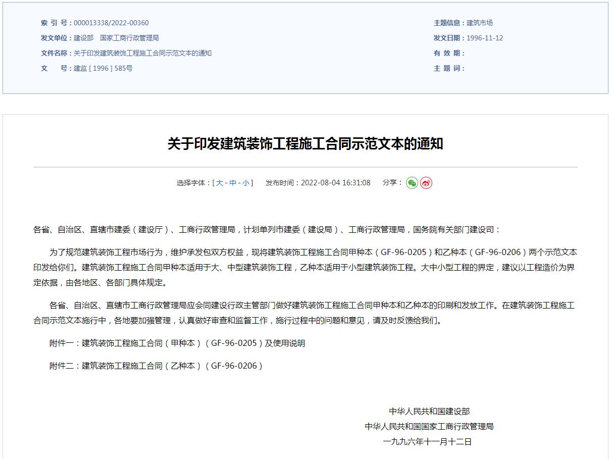 2022年8月4日國家住房和城鄉(xiāng)建設(shè)部發(fā)布了《關(guān)于印發(fā)建筑裝飾工程施工合同示范文本的通知》建監(jiān)[1996]585號文。該通知為建筑裝飾工程施工合同的使用給出了指導意見,全文如下。 隨著企業(yè)承接項目數(shù)量的不斷增加,施工合同的簽訂工作不斷增多,合同是減少和防止發(fā)生爭議的重要措施,本次通知下發(fā)的示范文本對于甲方、乙方的權(quán)利義務和違約責任予以了明確,切實維護合同當事人的合法權(quán)益,為企業(yè)的合同簽訂工作給予了指導。 示范文本詳見附件。 附件1:建筑裝飾工程施工合同(甲種本)(GF-96-0205)及使用說明 附件2:建筑裝飾工程施工合同(乙種本)(GF-96-0206) 文章來源:國家住房和城鄉(xiāng)建設(shè)部網(wǎng)站