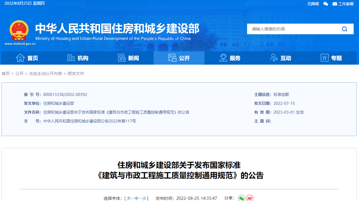 國(guó)家住建部:發(fā)布國(guó)家標(biāo)準(zhǔn) 《建筑與市政工程施工質(zhì)量控制通用規(guī)范》