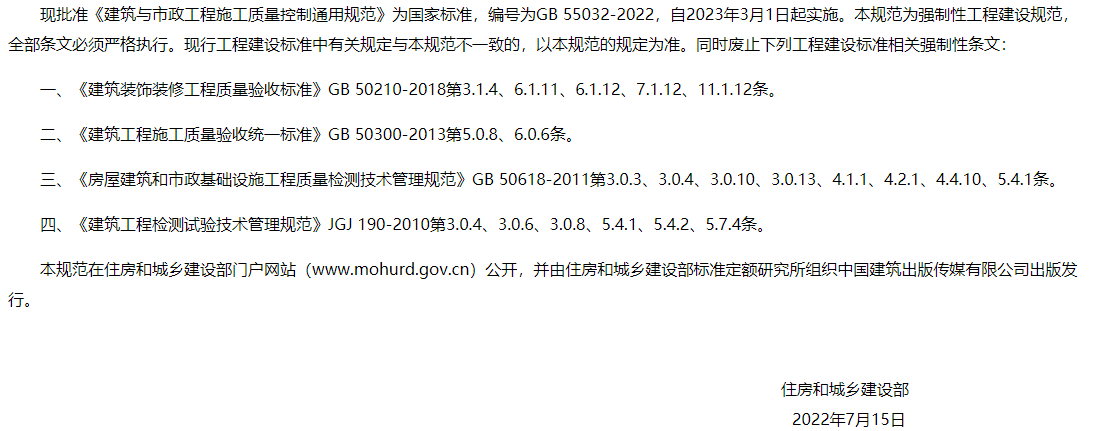 原文鏈接及附件下載:住房和城鄉(xiāng)建設(shè)部關(guān)于發(fā)布國(guó)家標(biāo)準(zhǔn) 《建筑與市政工程施工質(zhì)量控制通用規(guī)范》的公告  https://www.mohurd.gov.cn/gongkai/fdzdgknr/zfhcxjsbwj/202208/20220825_767714.html