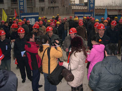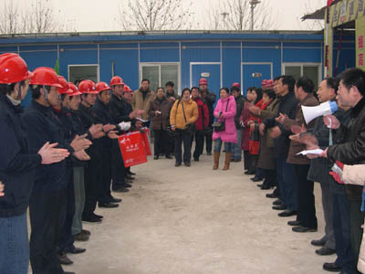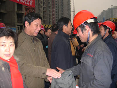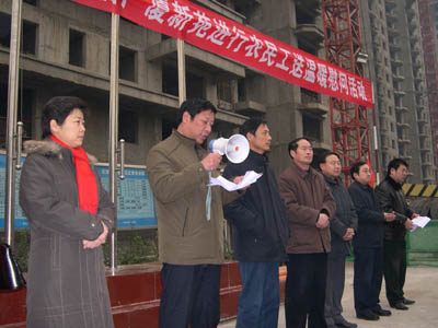 2008年1月10日是一個普通的日子,但對于建工(集團(tuán))廣廈工地上的農(nóng)民工來說卻是難忘的一天。這一天天氣格外寒冷,氣溫驟降給建筑工人戶外作業(yè)增加了勞動難度和強(qiáng)度。安陽建工(集團(tuán))各建筑工地上的工人師傅們和往常一樣仍堅(jiān)守在各自的工作崗位上,依然認(rèn)真工作、辛勤勞動著,他們絲毫沒有因?yàn)橥獠織l件艱苦而影響了工作。安陽市總工會主席聶孟磊、副主席陰春生、保障部部長呂啟霞 、城建水利工會主席陳亮等一行在這一天帶著100件羽絨服、100本《農(nóng)民工知識讀本》和對廣大農(nóng)民工的一片關(guān)愛來到了廣廈新苑工地,為那里的農(nóng)民工送去了溫暖。公司領(lǐng)導(dǎo)謝海如、馬松林、鐘新安及市機(jī)關(guān)事務(wù)管理局廣廈新苑指揮部人員參加了這次送溫暖活動。公司黨委副書記、工會主席馬松林主持儀式。