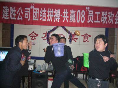 公司副經(jīng)理董建新為公司的興旺發(fā)達、員工的健康、家庭和睦而干杯的提議拉開了聯(lián)歡會的帷幕。溜光溢彩,歡聲一片。小游戲,文藝節(jié)目穿插互動。其中投籃趣味性較強,背藍的員工必須走動,而投藍手拿的是輕飄的氣球,難度較大;看表情猜飲料要求兩名員工一組,一個喝貌似相同的飲料,另一個從他瞬間表現(xiàn)猜喝的什么飲料,這不光需要相互間配合的默切,更需要判斷力,假如要加深對成語張冠李戴的理解,這也算得上是不錯的課堂。
