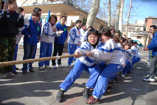 運(yùn)動(dòng)會(huì)共設(shè)有個(gè)人項(xiàng)目和團(tuán)體比賽項(xiàng)目,每個(gè)項(xiàng)目分兩輪進(jìn)行比賽,第一個(gè)進(jìn)行的“快樂呼啦圈”是個(gè)人參賽項(xiàng)目,分別由紅隊(duì)的紀(jì)敏和藍(lán)隊(duì)的徐萌獲勝;“鳳凰歸巢”是團(tuán)體項(xiàng)目,要求一名隊(duì)員手持筐,另一名隊(duì)員在指定位置把毽子投入筐中,你可別小看這空中飛毽,沒有一定的準(zhǔn)頭還真扔不進(jìn)去;接下來的“手足情深、蜈蚣競(jìng)走”、“接力賽”和“心心相印”也都是團(tuán)體項(xiàng)目,需要隊(duì)員相互的配合才能完成,比賽過程緊張激烈,妙趣橫生,各隊(duì)選手是奮進(jìn)齊驅(qū),一爭(zhēng)上下;最后進(jìn)行的拔河比賽更是扣動(dòng)人心,要求各隊(duì)的隊(duì)長(zhǎng)必須要參加,先抽簽進(jìn)行第一輪4進(jìn)2,再2進(jìn)1,三局兩勝定勝負(fù),各隊(duì)派10名隊(duì)員參加,隨著裁判的一聲哨響,長(zhǎng)繩兩旁的隊(duì)員們開始奮力的拉繩,啦啦隊(duì)員的加油聲更是激奮了動(dòng)力和斗志,最后,紅隊(duì)一舉獲勝,不僅贏取了這個(gè)比賽項(xiàng)目的獲勝獎(jiǎng),也是所有比賽項(xiàng)目中獲勝最多的一隊(duì)。頒獎(jiǎng)儀式由工會(huì)主席馬松林主持,公司領(lǐng)導(dǎo)親自為獲獎(jiǎng)選手頒獎(jiǎng)并合影留念,三八趣味運(yùn)動(dòng)會(huì)在美妙的音樂和歡慶的舞蹈中圓滿的畫上了尾聲。