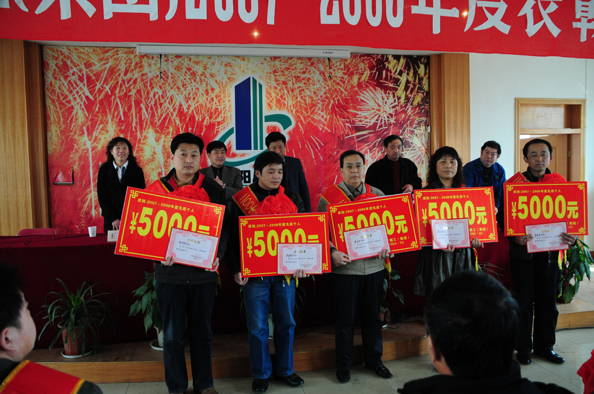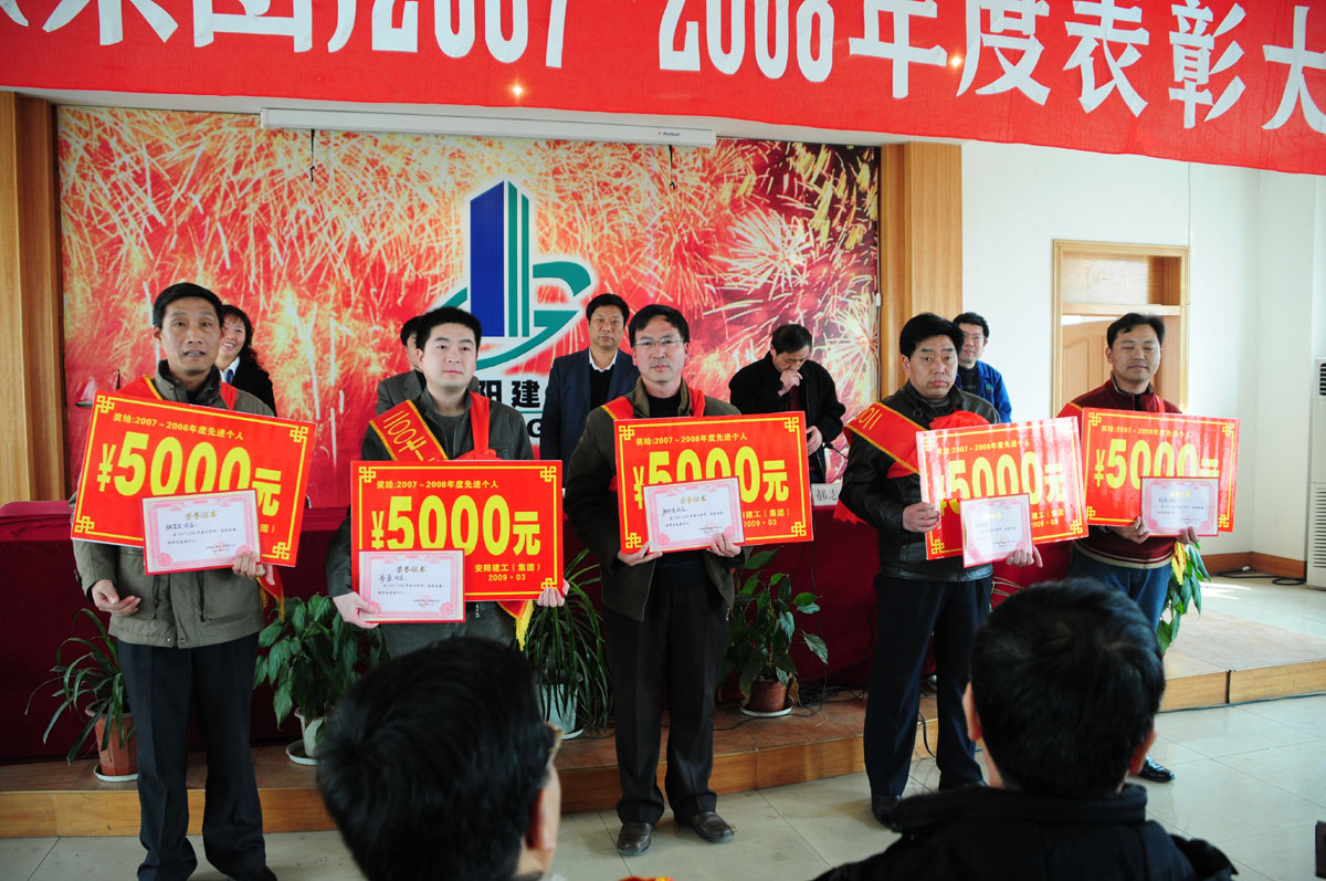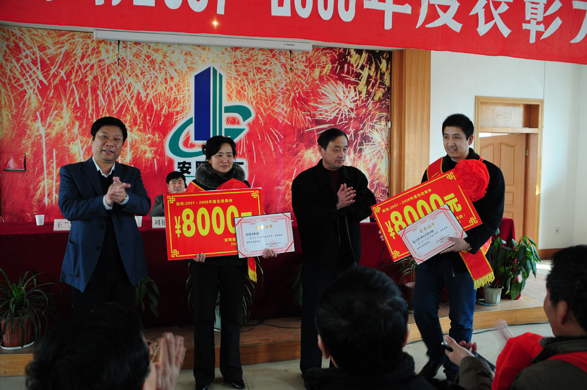 三點時分,大會在嘹亮的《國歌》聲中拉開序幕,公司副總經(jīng)理郝志峰同志宣讀表彰決定, 決定對在2007——2008年度涌現(xiàn)出的新鄉(xiāng)博物院項目部等兩個先進集體和肖愛亭等十名先進個人予以通報表彰。在歡快的樂曲聲中,公司領(lǐng)導(dǎo)為先進集體及先進個人頒發(fā)榮譽證書并分別給予先進集體8000元、先進個人5000元的獎勵,兩個先進集體代表和十名先進個人代表披紅掛花,上臺領(lǐng)獎,整個大會場面既隆重又熱烈。
