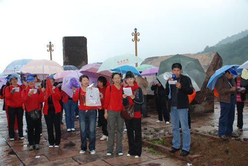 天空雖然飄著細(xì)雨,但大家熱情高漲.由聶磊、肖丹、黨飛主持的紅歌會(huì)上,大家用歌聲向新中國(guó)60歲生日獻(xiàn)上了一份厚禮, 《咱建工的人》唱出了建工人的氣勢(shì)和豪情;拉歌賽表達(dá)了建工人的一份愛國(guó)之情,馬主席作了熱情洋溢地動(dòng)員講話,他說(shuō)“這是公司工會(huì)組織的人數(shù)最多,規(guī)模最大的一次旅游,意義重大,這不僅是一次娛樂活動(dòng),更是集團(tuán)公司精神風(fēng)貌的展示活動(dòng)。今天讓我們放飛心情,和大自然親密接觸,最后祝愿大家四句話:開心出發(fā),安全第一;放松游山,凱旋而歸!”